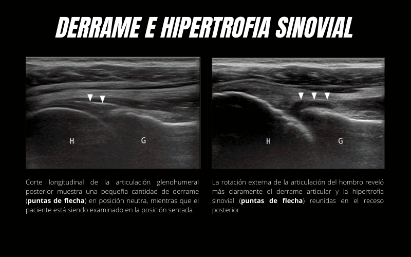 El derrame articular se detecta comúnmente en el receso posterior de la articulación glenohumeral y la vaina tendinosa de LHBT por comunicación con la articulación glenohumeral.